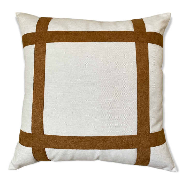 A Almofada Royal Linho Cru e Veludo Caramelo 45x45 une o acolhimento do veludo caramelo texturizado à leveza do linho cru, com trabalho manual que evidencia cada faixa aplicada. Um luxo acolhedor para composições elegantes.