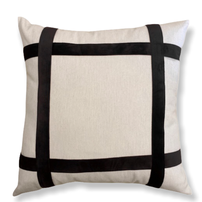 Com faixas de veludo preto aplicadas uma a uma sobre o linho cru, a almofada ganha textura, contraste e profundidade visual únicos. O resultado é uma composição clássica e contemporânea ao mesmo tempo, capaz de se destacar em qualquer ambiente com elegância e personalidade.