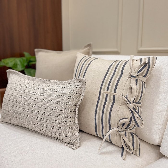 Produzidas com tecidos nobres de algodão e linho, as almofadas apresentam acabamentos únicos: laços laterais delicados, tramaso com sutil em relevo e uma peça neutra em tom areia — um verdadeiro coringa atemporal. A harmonia entre as listras cinza e azul e o toque artesanal dos acabamentos reforçam a identidade sofisticada da Coleção Farm House, símbolo do estilo natural chic da Lisieux.