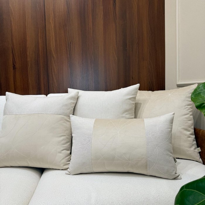 O Kit Fluire nasce da união entre o linho cru natural e o veludo Bege encorpado, criando uma composição que reflete fluidez, elegância e conforto. Cada almofada é cuidadosamente confeccionada com pespontos feitos à mão livre, formando linhas que se cruzam como raios delicados em um desenho artístico que transmite leveza e movimento, formando flores abstratas.