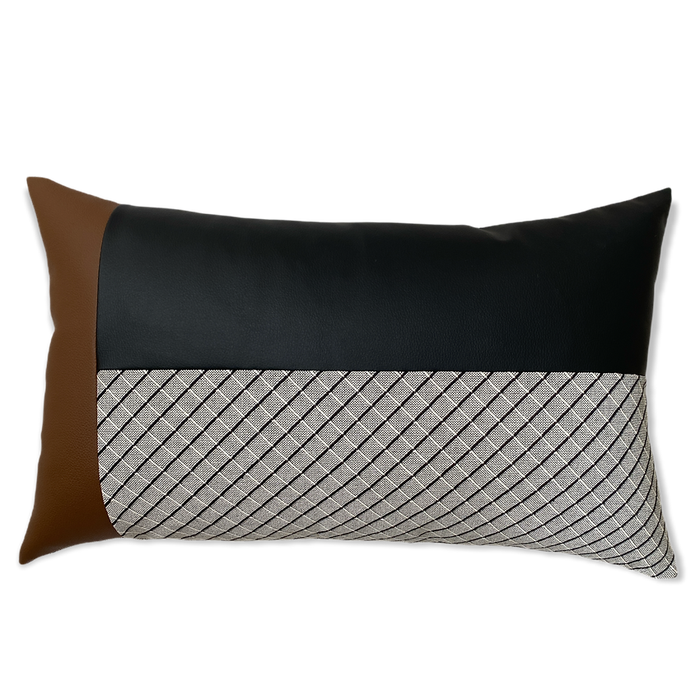 Produzida em jacquard 100% algodão, sua padronagem geométrica é formada pelo entrelace preciso dos fios preto e branco, que criam uma textura visual rica e agradável ao toque. O design é finalizado com detalhes em courino Whiskey e Preto, adicionando profundidade e elegância à peça.