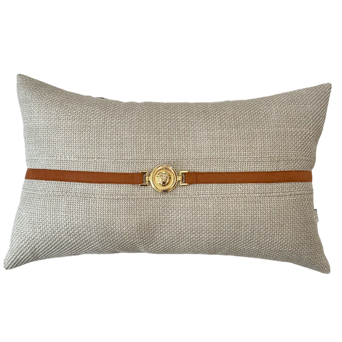 A Almofada Guardian Bege e Terracota foi criada para aquecer o ambiente com sofisticação. Sua trama bege detalhada contrasta harmoniosamente com o cinto em tom terracota e a ferragem dourada de Leão, que simboliza força, proteção e energia vital.