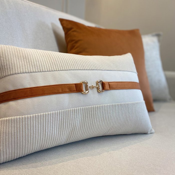 O destaque fica por conta do cinto com ferragem dourada de bridão, um símbolo de força e elegância que traduz o DNA da coleção. O Kit Hereditas Terracota é ideal para quem busca almofadas decorativas de luxo com propósito e design autoral.