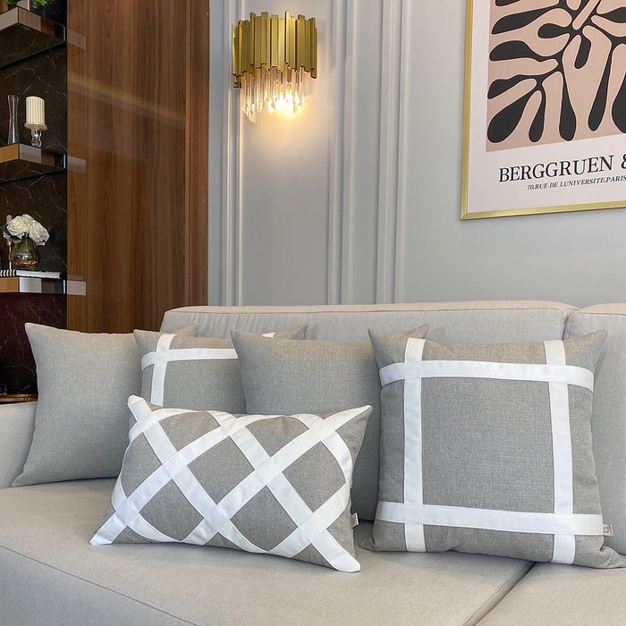 Kit Royal Linho Cinza e Veludo Branco 5 Almofadas: Sofisticação e Pureza em Cada Detalhe
